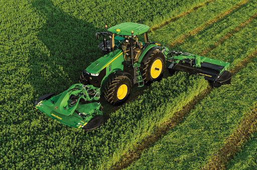 Row crop tractors are large tractors built for large heavy-duty agricultural jobs. The John Deere row crop tractor lineup includes the 6M, 6R, 7, and 8 series tractors. As the name suggests, due to their adequate row spacing, they are ideal for applications where crops are planted in rows. These powerhouses are built to last through the toughest conditions without any hassle. They are also highly durable and reliable. Triple Link Suspension gives the tractors optimal traction and performance by maintaining ground-to-tire contact. Just like the utility tractors, there are many transmissions and horsepower options available along with fully integrated PrecisionAg technology. Select models also have the Ultimate Comfort and Convenience package to give operators a smooth and pleasurable ride.