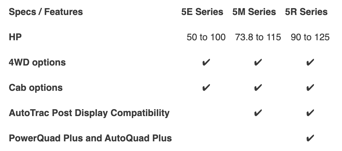 Each series offers different transmission options, but two things remain the same across the board: simple operation and efficient results. With seamless direction control, transmissions like the 12F/12R found on the 5E Series offer effortless shifting to make repetitive chores easy while the CommandQuad transmission features AutoClutch and AutoMode settings on the 6M tractors. The AutoQuad Plus and PowerQuad Plus transmissions offer four gears, cruise control, and infinitely adjustable shift points for premium efficiency on select 5R tractors.Tough Power